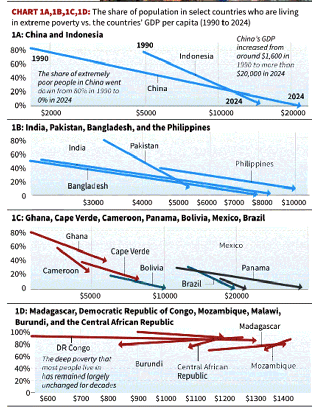 - China, Indonesia, India, Bangladesh → large initial poverty shares (>60%)