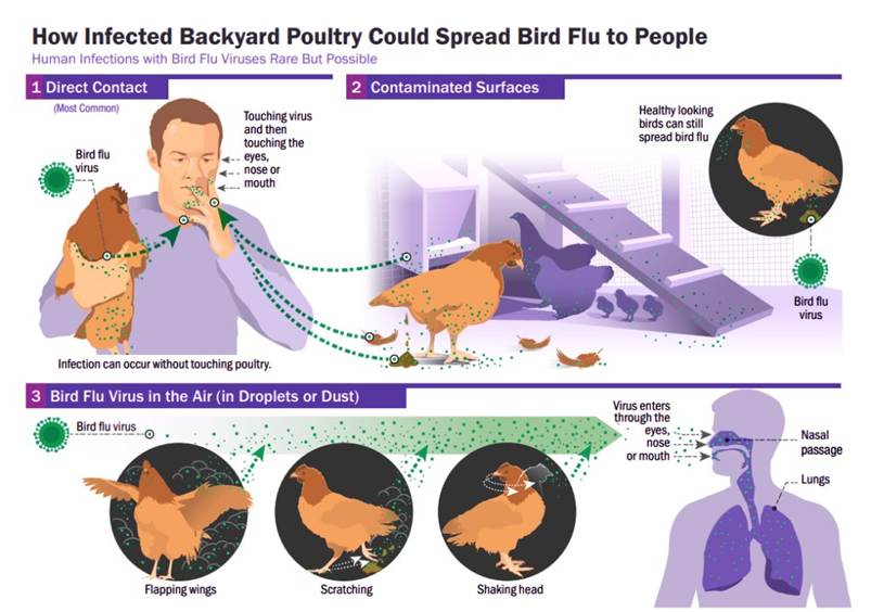 - Human infection mainly occurs through direct handling of infected birds, carcasses, or contaminated environments, especially in farms and live bird markets with poor biosecurity.