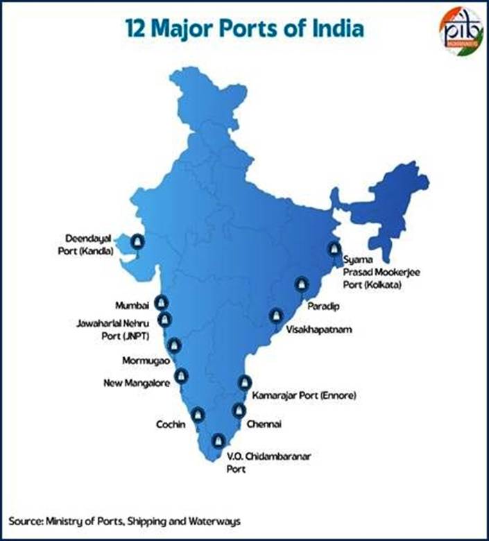 • India has 12 Major Ports (under Union Government) and 200+ Non-major ports (State control) under Indian Ports Act, 1908 & Major Port Authorities Act, 2021.