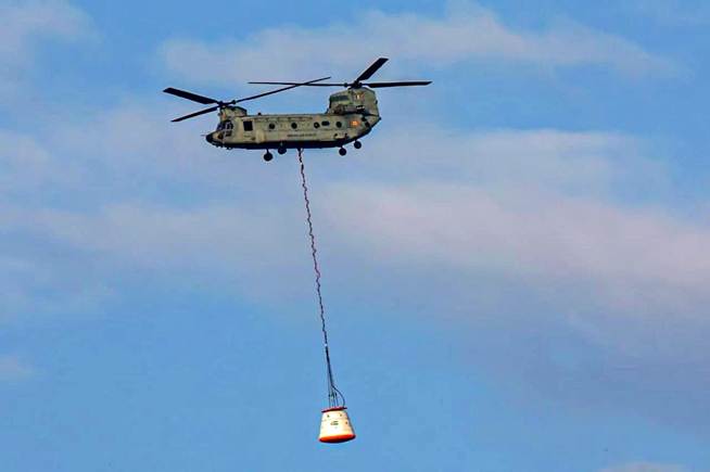 • Crew Module (~5.7 tonnes) lifted by Chinook helicopter to ~3 km altitude, simulating re-entry descent conditions.