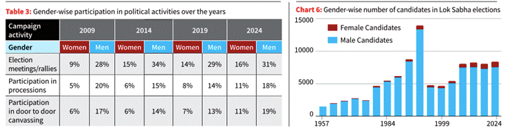 - Despite voting parity, women remain significantly less active in campaign-level political activities such as attending rallies, processions, or door-to-door canvassing.
