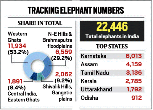 - Significant decline: India’s wild elephant population has dipped by nearly 18% over the last two decades.