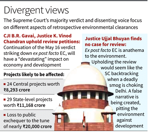 - A three-judge Bench of the Supreme Court has recalled its May 16, 2025 judgment that had declared retrospective/ex-post facto environmental clearances as “gross illegality”.