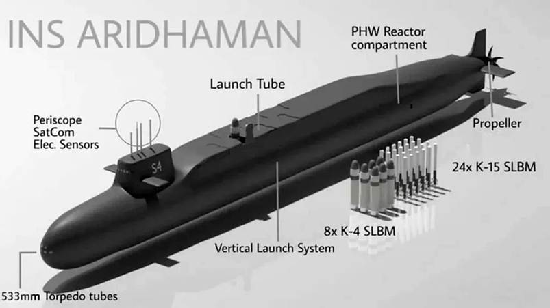 • Can carry 24 K-15 Sagarika missiles or 8 K-4/K-5 nuclear missiles, doubling earlier payload capacity.