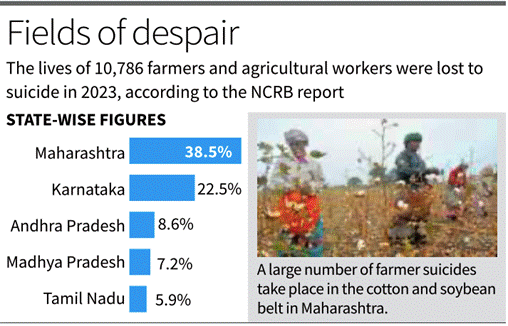 • Why in News: NCRB 2023 data shows persistent agrarian distress with over 10,000 farm-related suicides, concentrated in Maharashtra, Karnataka, and Andhra Pradesh.