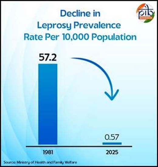 • As of March 2025, India has sustained leprosy elimination status nationally with 31 States and 638 districts achieving prevalence rate <1/10,000 population.