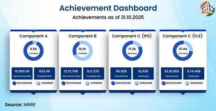 - Massive scale-up recorded under PM Surya Ghar, PM-KUSUM, Solar Parks, and PLI for Solar PV Manufacturing.