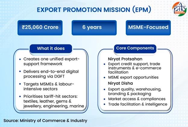 - The Export Promotion Mission (EPM) represents a structural reform in India’s export governance.