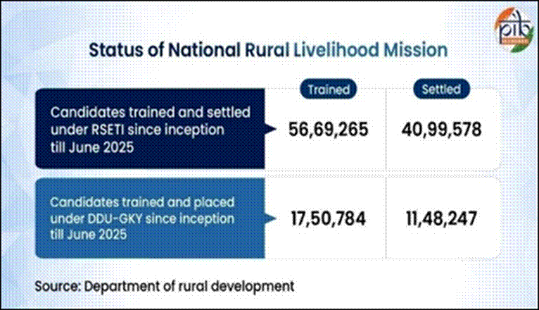 - Top States: UP (7.55 lakh trained, 5.54 lakh settled), Rajasthan, MP, Karnataka.