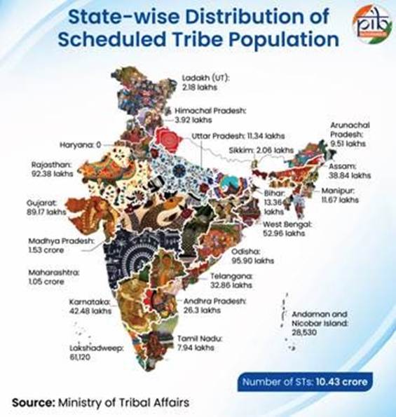 - Over 705 tribal communities (8.6% of population) represented through arts, handicrafts, and textile traditions.