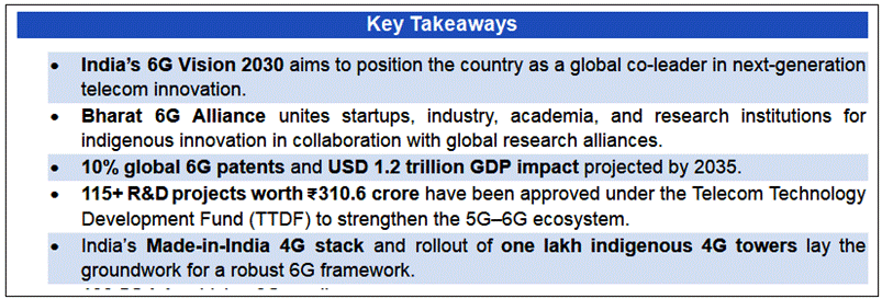 • India’s 6G roadmap transforms telecom from an import-dependent sector to an export-capable innovation engine.