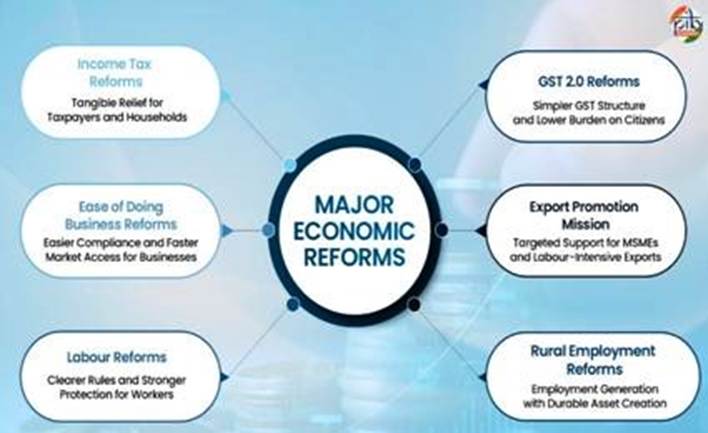 - Growth-oriented reforms — tax rationalisation, GST 2.0, MSME expansion, export promotion