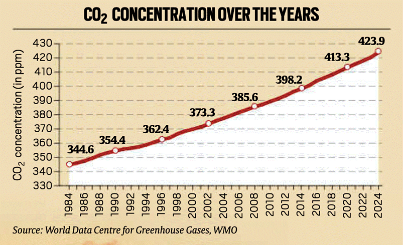 - Event: World Meteorological Organization (WMO) released data showing a record rise in global CO2 concentrations between 2022 and 2024.