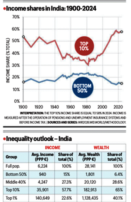 - The World Inequality Report 2026, led by economists Lucas Chancel, Ricardo Gómez-Carrero, Ravaida Mushrif, and Thomas Piketty, reveals that India’s income inequality is among the highest in the world.